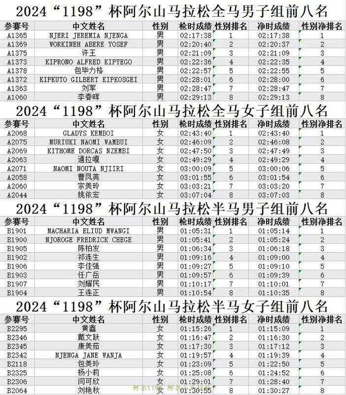 现将2024“阿尔1198”杯阿尔山马拉松全马男子组、女子组,半马男子组、女子组前八名成绩公示如下: